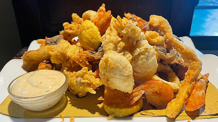 Mixed fried fish with carrots, sweet potatoes, courgette and paprika mayonnaise