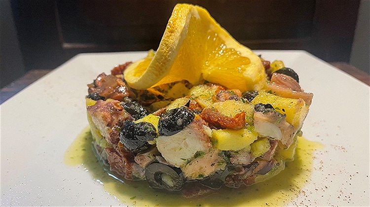 Salada de polvo com batatas, tomates secos, azeitonas pretas e alcaparras