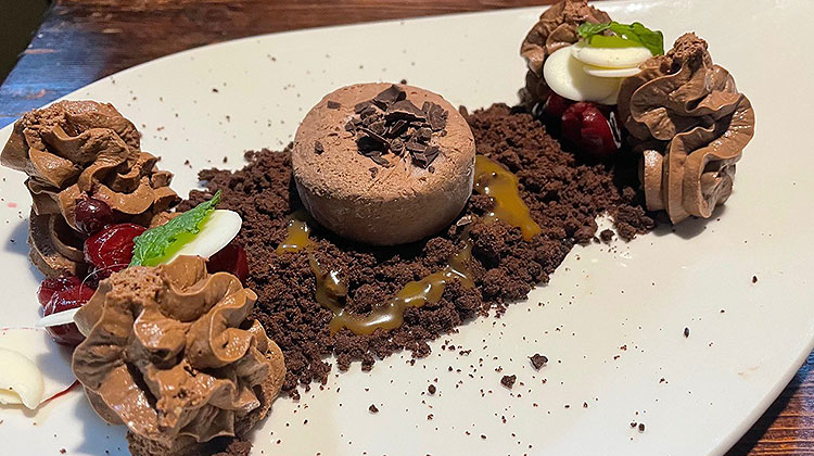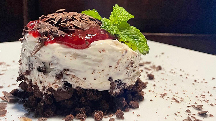 Mousse de queijo doce, flocos de chocolate amargo e coulisse de morango com base de biscoito