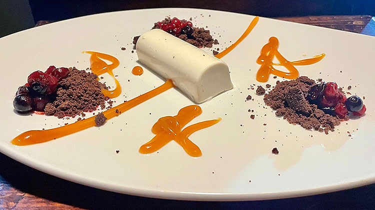 Pannacotta alla camomilla, con frutti di bosco, crumble e caramello salato