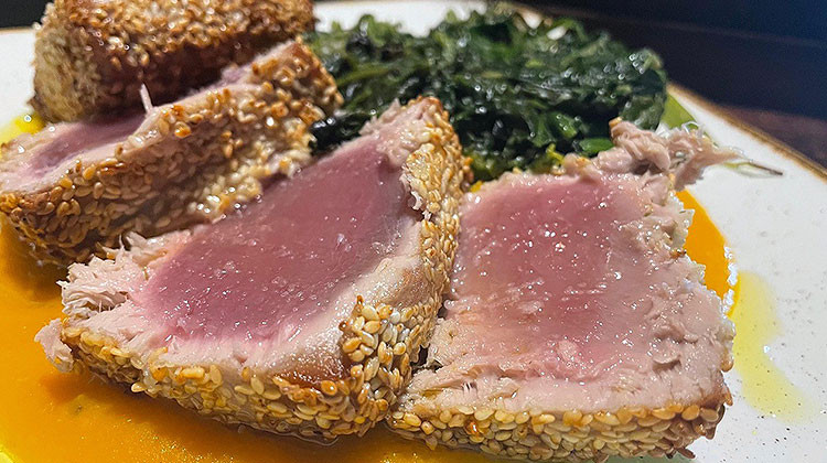 Tataki de atum em crosta de sesamy, salsa de camarôes e espinafres