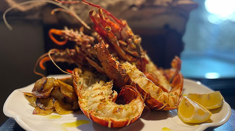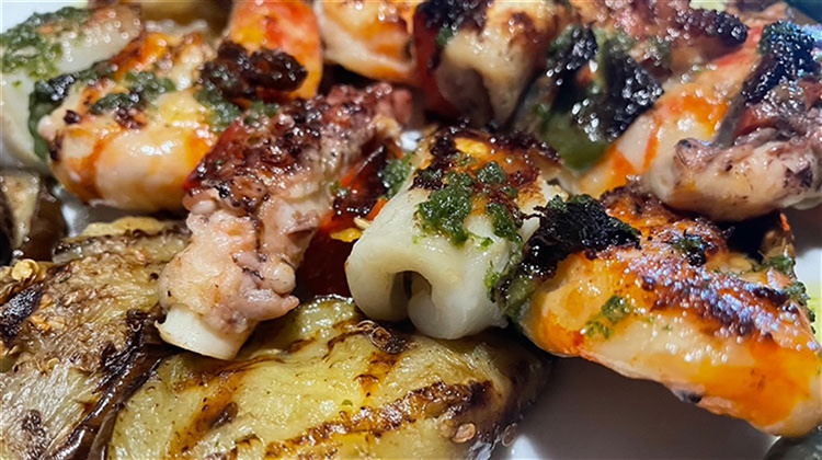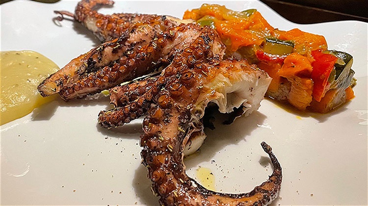 Grilled octopus on cream of rosemary potatoes and ratatouille