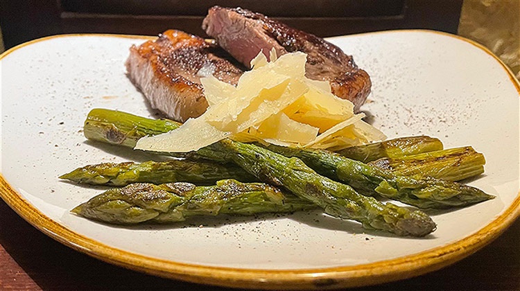 Entrecosto de carne grelhada com espargos e flocos de Parmesâo