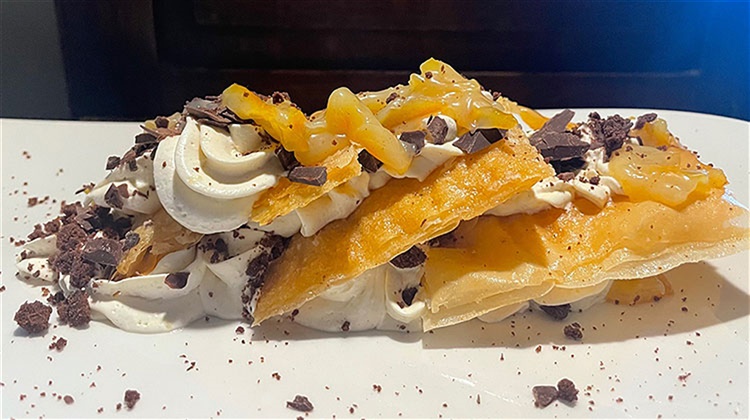 Millefeuille com creme de chantilly, chocolate amargo, massa esfarelada e frutas cftricas cristalizadas