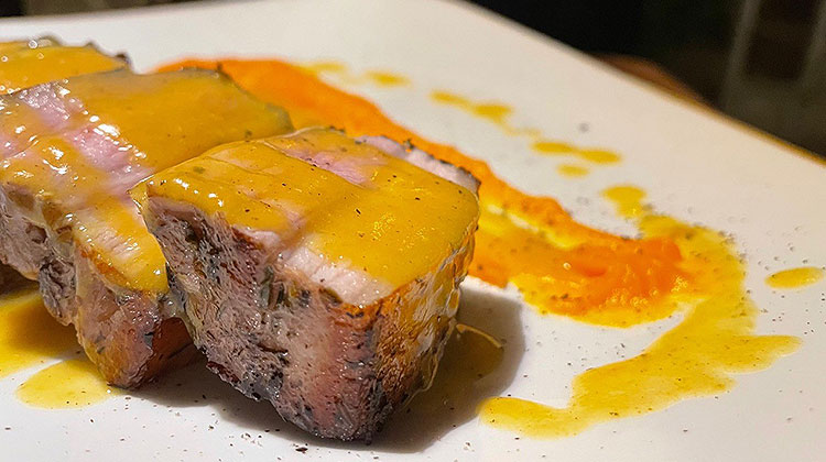 Barriga de porco assada com mostarda, mel e creme de cenoura