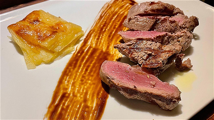 Tagliata di filetto di manzo con aceto balsamico e millefoglie di patata