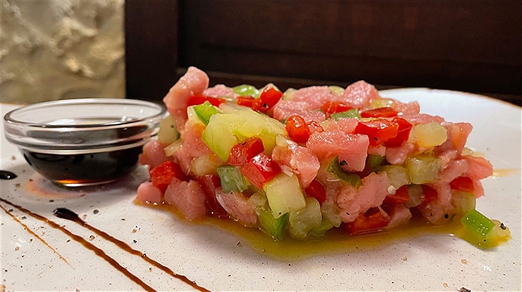 Tartare di tonno con peperone, cetriolo e riduzione di soia al miele